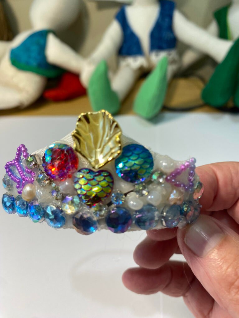 Included with each mermaid is her own bespoke crown and a wand with a pearl inside 2 clam shells and a pearl necklace.
