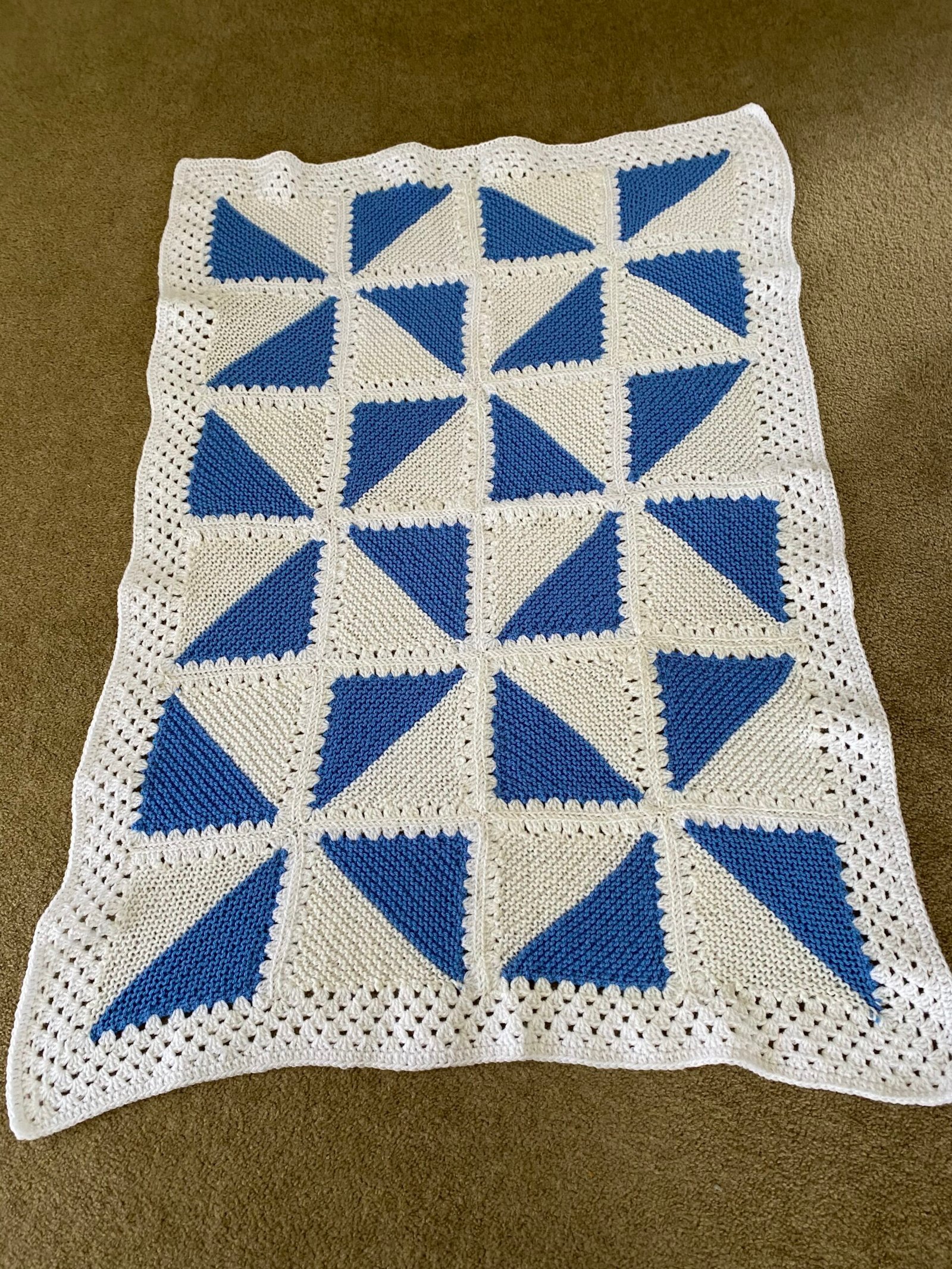 Made in 8ply blue and pink using soft acrylic this blanket is knitted and seemed together with crochet.