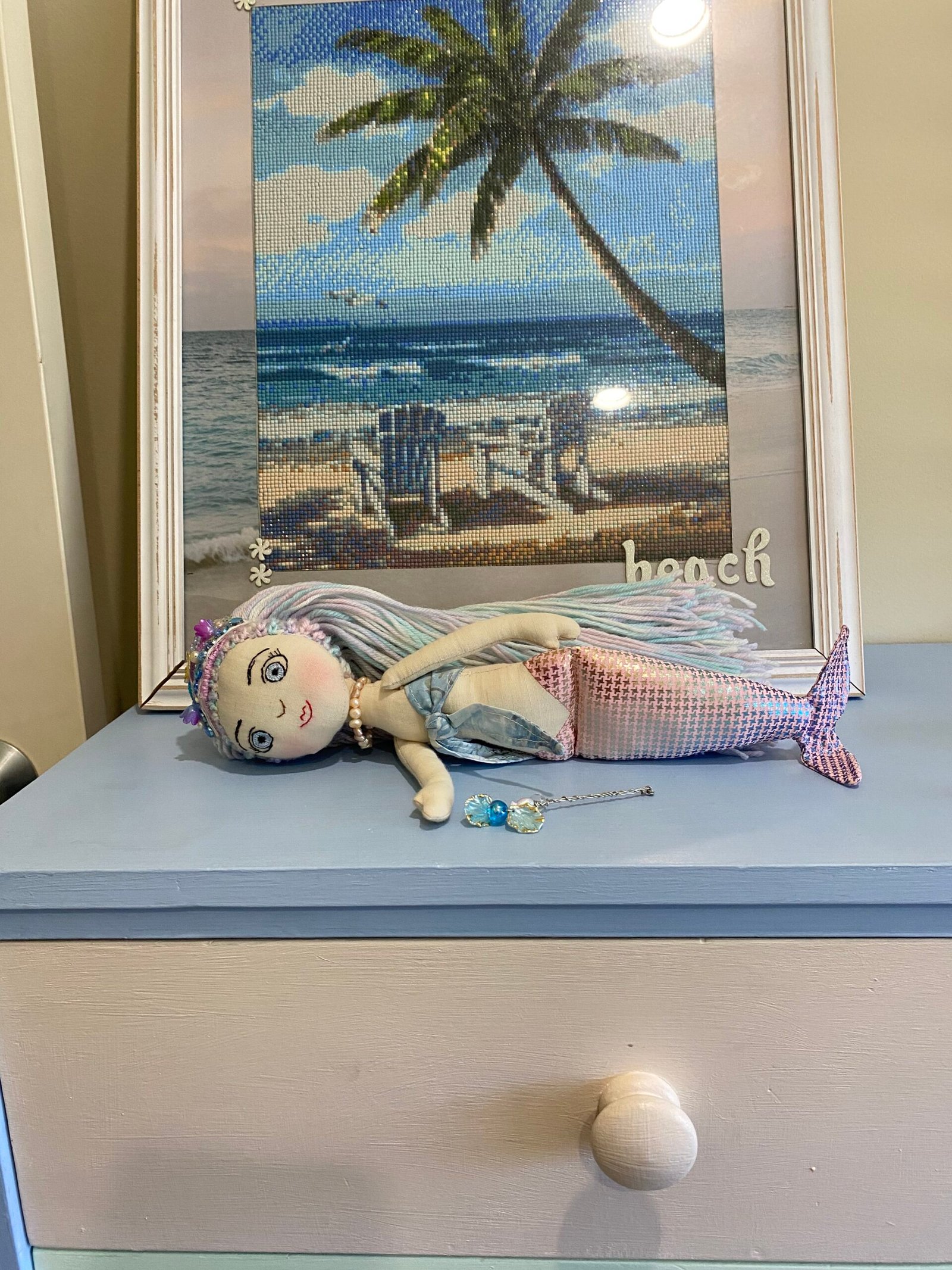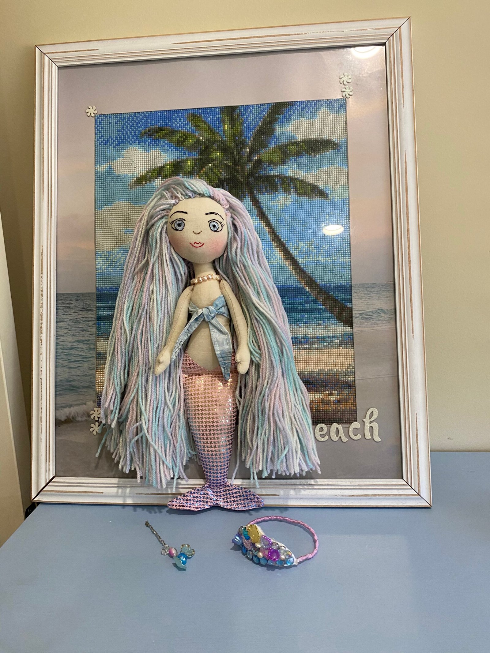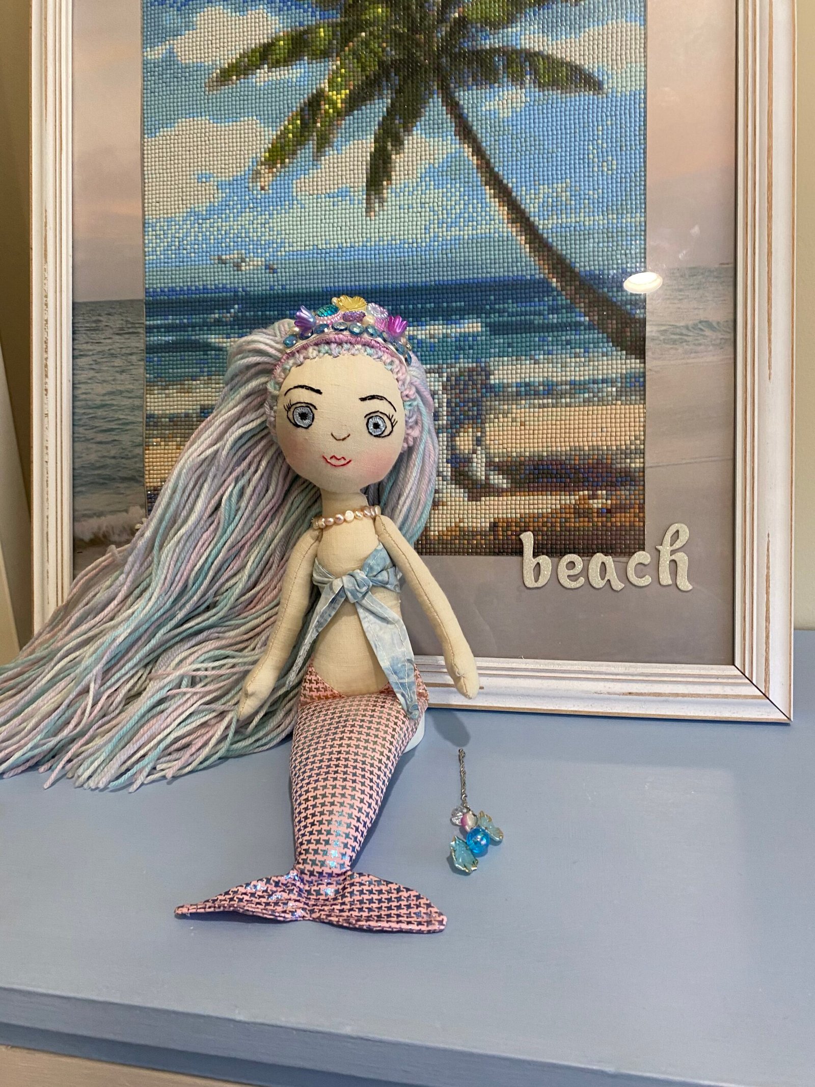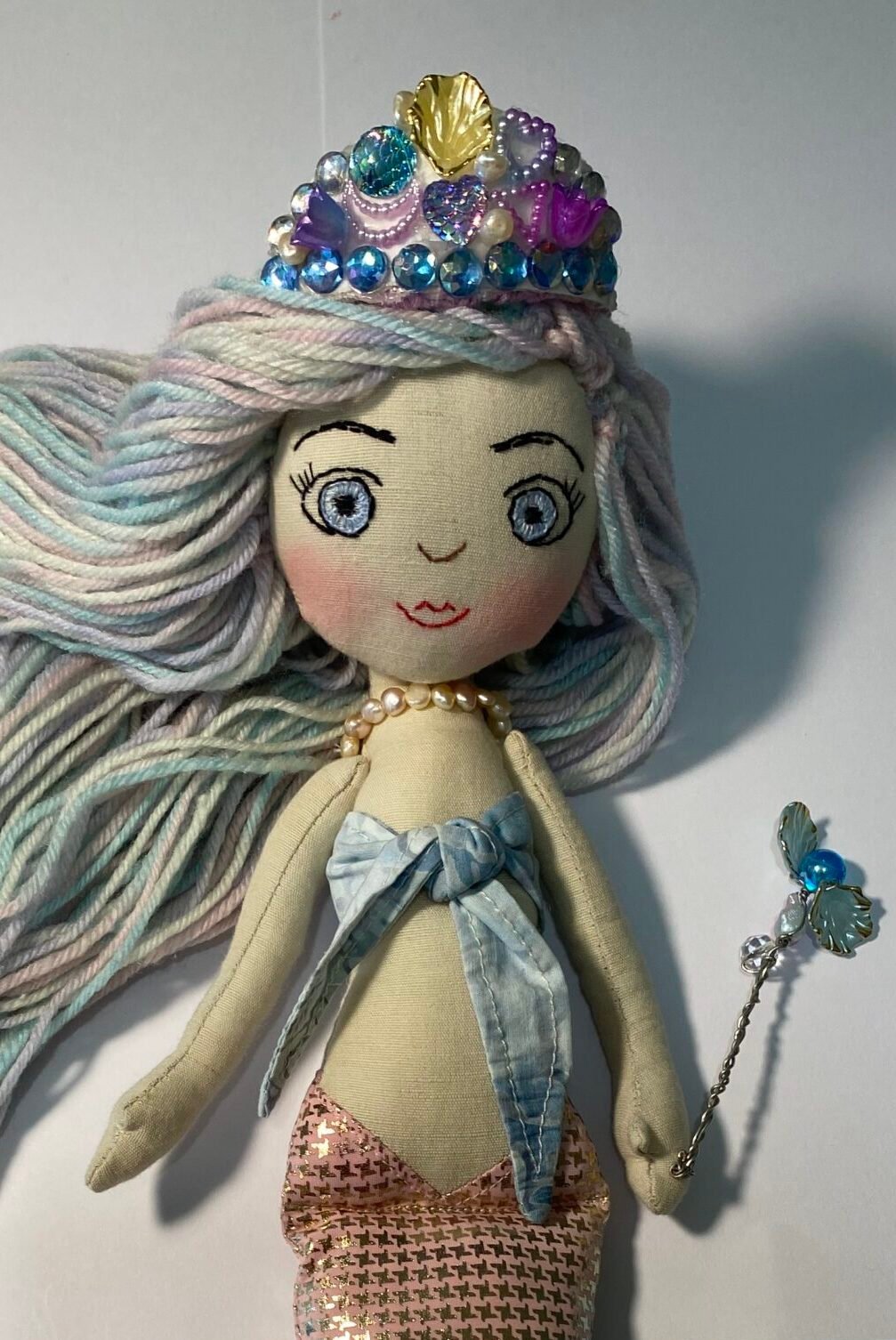 Her wand has a blue pearl and she is wearing a bespoke handcrafted crown with pearls and shells and glittering mermaid gems.