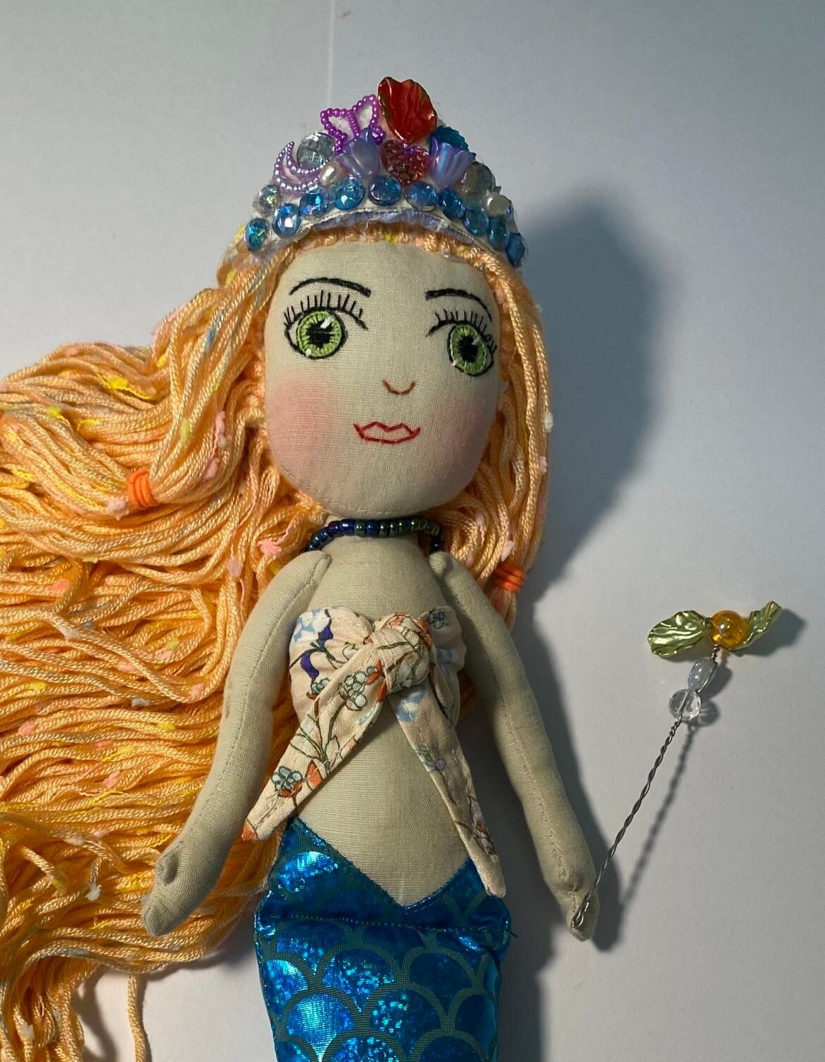 Her wand has a golden pearl to match her hair and she is wearing a bespoke handcrafted crown with pearls and shells and glittering mermaid gems.