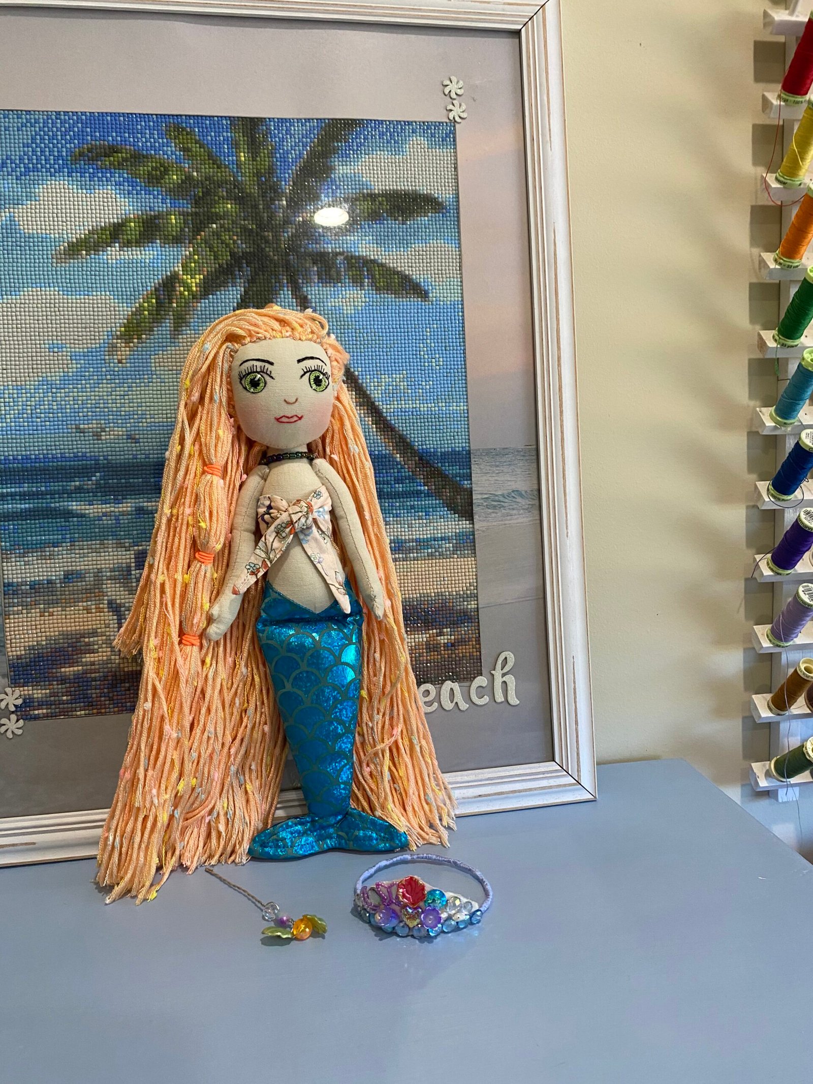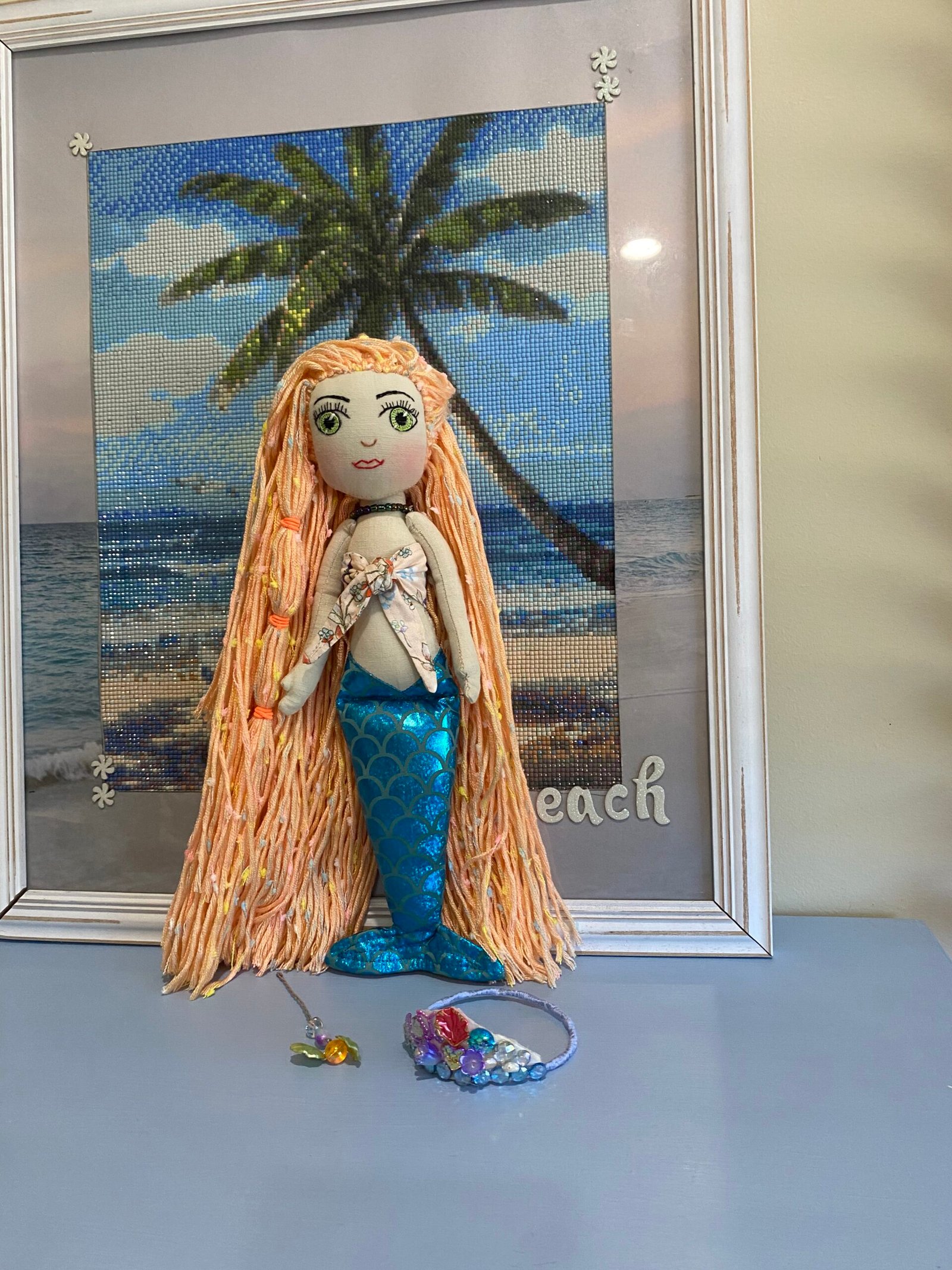 She has lovely orange hair and green eyes. Her tail is glittering blue nd she is wearing a matching blue/green mermaid pearl necklace.