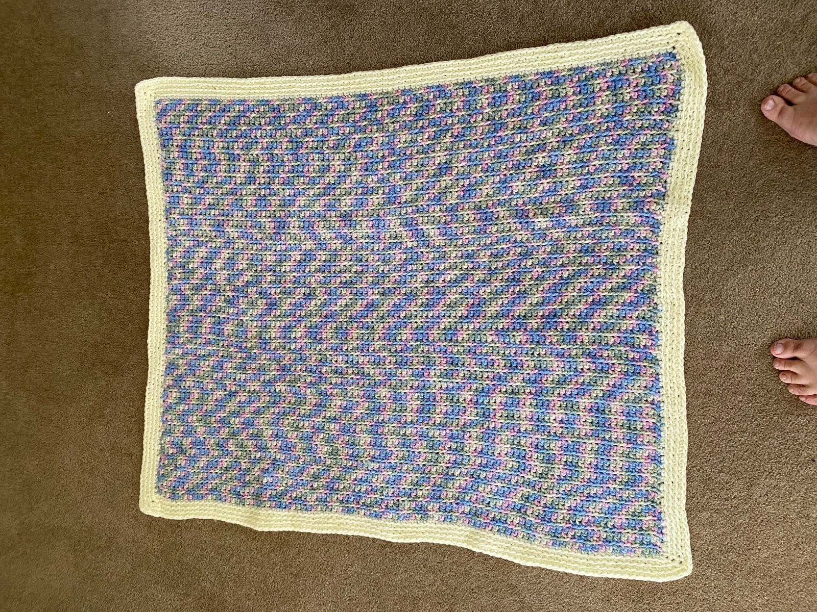 Made in 10 ply multi coloured soft acrylic  and bordered in a pale yellow to bring out the colour.